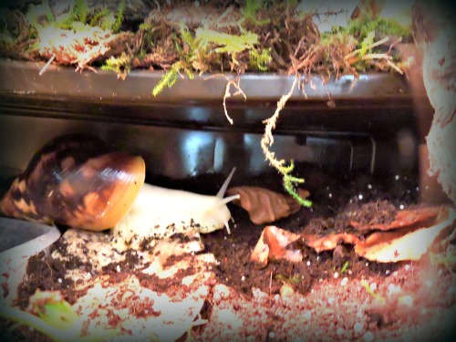 Ich habe festgestellt, dass meine es mögen, wenn die Heilerde nicht gleichmäßig am Boden verteilt, sondern ein Hügel vorhanden ist. Es ist äußerst unterhaltsam. Während die eine Schnecke die Augen komplett vor dem Mund nach unten klappt und alles genau anschaut, bevor sie hinkriecht, stehen bei der anderen die Fühler straff senkrecht aufgerichtet nach oben. Wieder eine andere zieht die Fühler ein bevor sie im Wasser badet.