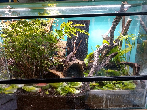 Für die Ovums hatte ich ein "Miniaquarium kleben lassen. Es stand auf dem Boden des Terrariums. Ich hatte dann Hölzer und Pflanzen in dem Becken, unten auch etwas Kies. Das Becken war so tief, dass ich eine kleine Zimmerbrunnenpumpe einstellen konnte.