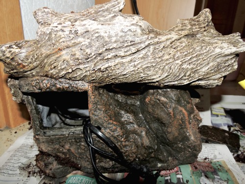 Das ist der Wasserfall von hinten. Das kleine Loch kann durch einen gleichfarbigen Schieber verschlossen werden. Aber man sieht, den Wasserspeicher kann man aufgrund der Bauweise nur ausspülen und grob mit der Zahnbürste reinigen. Übrigens war die Erde um dem Wasserfall doch recht nass. Nicht matschig, aber deutlich feuchter als im Rest des Beckens.