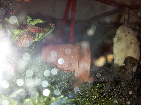 Die aktuelle Einrichtung - ca 7 Liter aufgekalkten Terrarienboden, sterilisierter Moos aus dem Wald (arbeite im Krankenhaus und nerve immer mal Kollegen aus dem Steri mit Moos sterilisieren - in eine Tüte einschweisen lassen, und dann 2 Stunden Plasmasterilisation , ist kaltes Verfahren, daher geht das ganz gut ), ein schönes Blümchen aus dem Blumenladen , ein Plastiktopf, ein Futternapf und große Sepiaschale.