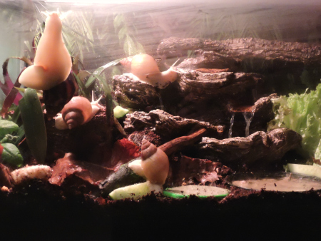 Im Becken hätte ich zusätzlich noch eine Schale mit Heilerde. Die Schnecken lieben es, im Heilerdebad zu graben und zu wühlen und sich mit breitem Fuß darin zu suhlen. Der Wasserfall wäre halt fließendes Wasser, würde etwas Bewegung in der Luft verursachen und wäre gut "beschleimbar". Er würde nicht dauerhaft laufen, sondern (mit Zeitschaltuhr gesteuert) zu Zeiten, in denen wir daheim sind. Einfach um reagieren zu können, wenn etwas sein sollte.