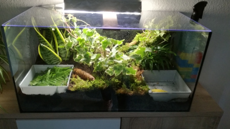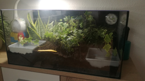 Es ist ein 60x30x30 Glasbecken da es erstmal nur 3 Babys werden reicht das erstmal, eine Vergrößerung auf 100/ 120 x 50 x 50 ist aber geplant sobald die Schneckis zu groß für ihr Zuhause sind.