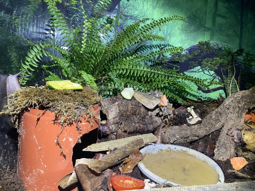 Meine Ovums lieben es, sich im Laub zu verbuddeln, deswegen habe ich damit fast die ganze Bodenfläche bedeckt. Ein anderer beliebter Schlafplatz sind die Ecken mit Sphagnum-Moos.