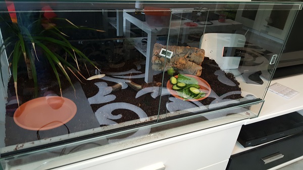 Du könntest die Belüftungsschiene aus Lochblech am vorderen Rand noch mit Moos bedecken oder mit Kork bekleben, dass die Schnecken sich nicht am Häuschen verletzen können, falls sie da mal doof drauf fallen.