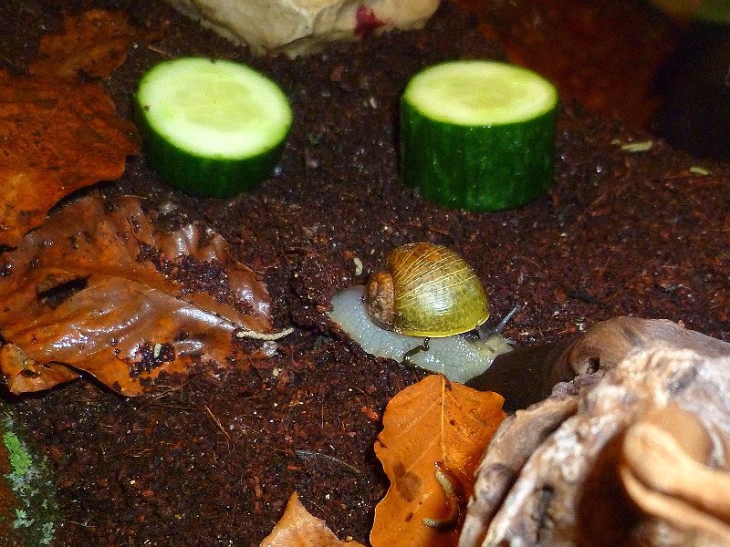 Es gibt Neues von der Wutz: Sie ist ganz beachtlich gewachsen, seit sie hier ist. An Masse hat sie sich locker verdoppelt und hat innerhalb der letzten zwei Wochen eine halbe Windung angebaut. Aktuelles Lieblingsfutter sind Flechten, Champignons und nach wie vor Gurke.
