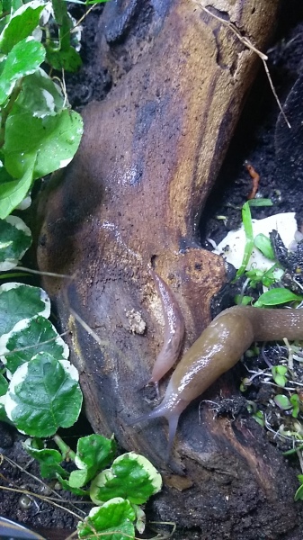 So und jetzt kommt's - weiter oben habe ich ja kurz den "mysteriösen Fund" erwähnt. Habe letztes Jahr im frühen Sommer in einem Gartencenter ein paar Blumen und Pflanzen gekauft und an einem Blumentopf hing eine kleine Nacktschnecke. Ich wusste nicht, welche Art das ist und ob sie überleben könnte wenn ich sie mit den neu gekauften Pflanzen einfach draussen lasse. Also habe ich sie in eines der Terrarien zu den Nudelschnecken gesetzt. Dort verschwand sie dann und ich habe sie sicher ein halbes Jahr nicht mehr gesehen. Bis zum Herbst, als plötzlich ein riesiges Alien sich zeigte