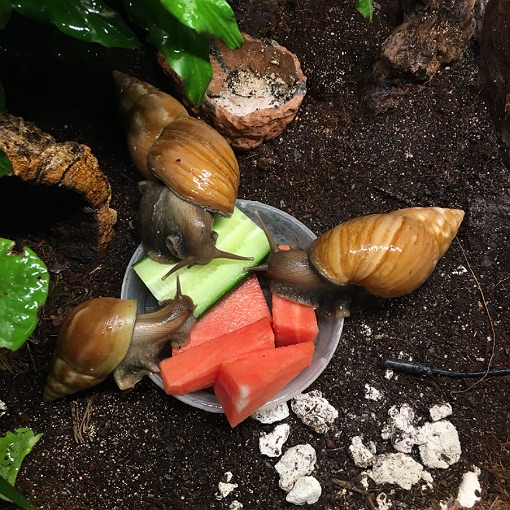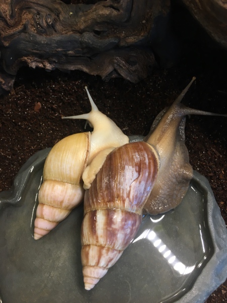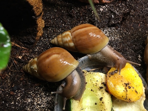 Derzeit leben in meinem zwei Terrarien insgesamt 16 Schnecken. Im „kleineren“ Mr. Perfect und Creamy mit 3 Jungschnecken (noch namenlos), die hierbleiben werden.