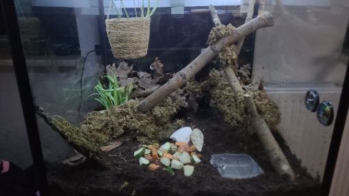Ein kurzes Update zum neuen Terra für die 3 Chaoten. Habe jetzt noch Moos und Laub mit rein getan, Rindenhöhlen und Äste zum verstecken und klettern. Die schwächelnde Grünlilie wird die Tage gegen eine rote Bromelie ausgetauscht.