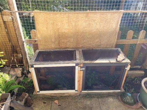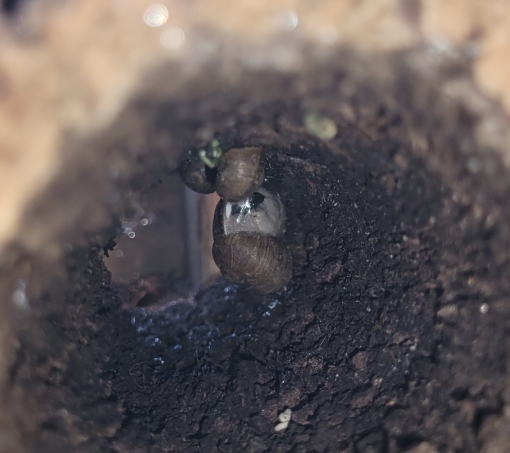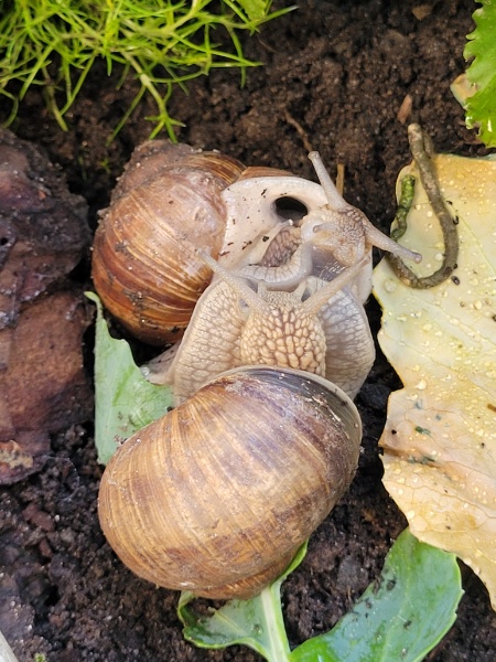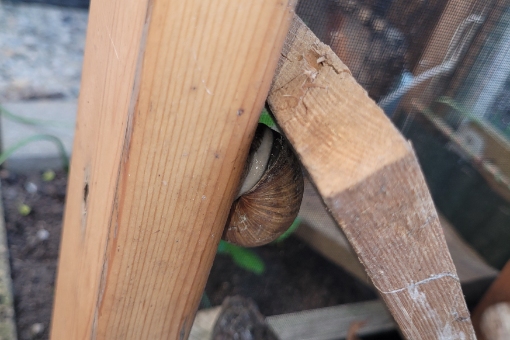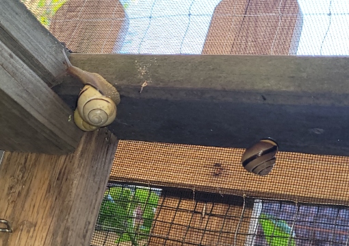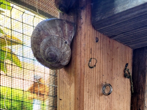 Auf alle Fälle habe ich das Gehege im Moment mit ein paar bereits in meinem Garten aufgetauchten Schneckis im Probebetrieb: 4 erwachsene und 3 jugendliche Helix pomatia und 5 Bänders in verschiedenen Altersstufen