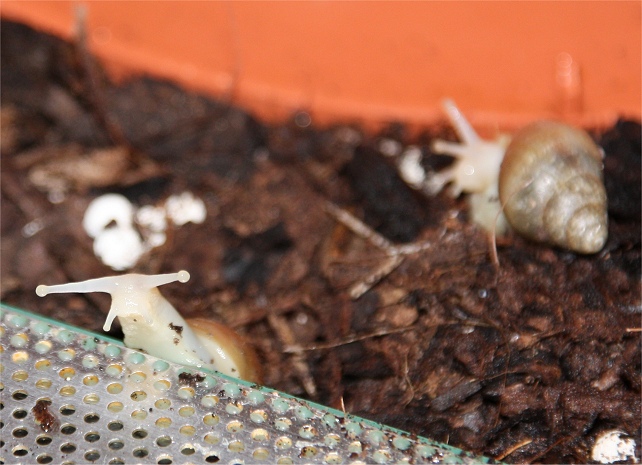 Also haben wir ein übliches 25W - Heizkabel (feuchtigkeitsgeeignet) an der Rückwand angebracht. Darüber kam ein Alublech, das wir mit Leisten befestigt haben. Die Leisten sind zwar geklebt, aber das Blech lässt sich herausnehmen. Das ganze wir über einen ThermoControl II gesteuert, damit es nicht zu warm wird. So haben die Schnecken eine Heizquelle innen, können aber das Blech trotzdem erklimmen ohne sich zu verbrennen. Der ThermoControl ist auf 25° eingestellt. Auf dem Blech habe ich an der heisstesten Stelle 30° gemessen. Die Lufttemperatur an der Scheibe, die am weitesten von der Heizung entfernt ist, beträgt immernoch 20°. Ein guter Schnitt, wie wir finden.