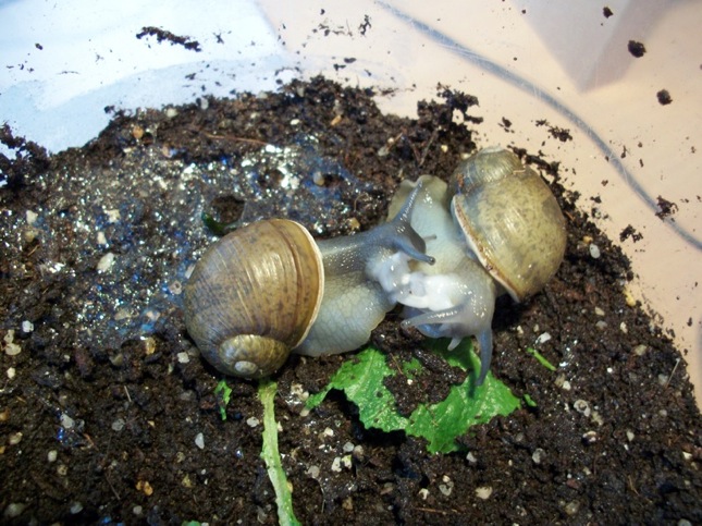 Hier sind sie sich in einer Umzugsgefäss nahe gekommen gleich kurz vor dem Wechsel zu einem neuen Terrarium. Und leider auch kurz vor dem Tod der jüngeren Grunzschnecke.