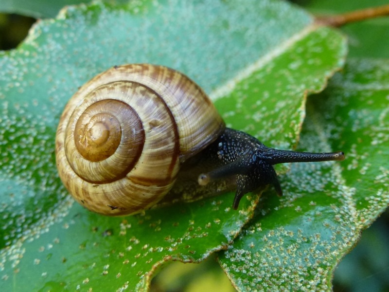 Darf ich vorstellen: Eine spitze Baumschnecke! Sie saß neben all den anderen Baumschnecken. Ich hoffe nun sehr, dass diese offenbar mutierte Gehäuseform genetisch vererbbar ist.