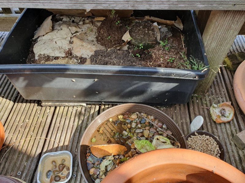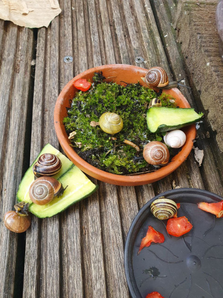 Zwei Futterstellen habe ich eingerichtet, an denen die Schnecken Gemüse und Salat bekommen, aber auch Sepiaschale, damit gerade die Jungtiere ihr Häuschen für den Winter ausbauen können.