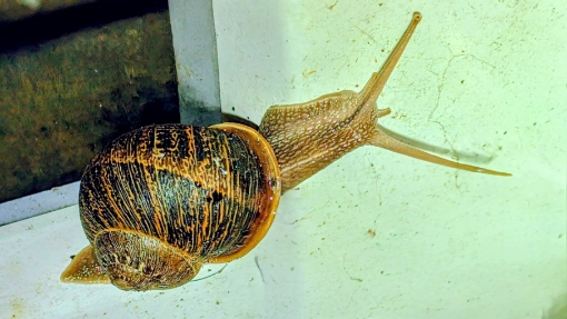 Nun möchte ich endlich hier meine Balkonbewohner vorstellen. Erstmals aufgefallen sind mir die Schnecken im Sommer 2024 aber da waren es nur zwei oder drei Weinberger und ein Tigerschnegel. Weiter beachtet habe ich das aber nicht, sie kamen auch nicht oft in mein Blickfeld. Dieses Jahr war es dann anders, bereits im Frühjahr fielen mir die ersten Schnecken auf wie sie ab späteren Abend über die Betonplatten schlenderten. Und ich beobachtete wie sie sich über Brekkies hermachten die am Boden lagen. Die Initialzündung die meine Aufmerksamkeit dann endgültig ins Laufen brachte war leider eine traurige. Nämlich ich trat auf eine Weinberger. Das Häuschen war stark angeknachst. Am nächsten Morgen war sie aber weg. Ein paar Tage habe ich dann jeden Abend ein paar Brekkies hingelegt bis ich anfing mich über Schnecken zu informieren weil sie mich innerhalb kurzer Zeit faszinierten. Und fand umgehend heraus das Brekkies nicht wirklich passende Nahrung ist. Seitdem stelle ich ihnen jeden Abend ein Buffet hin, meistens mit Salatblättern, Zucchini, Süßkartoffeln, Radieschenblättern, Sepiaschalen, gemörserte Eierschalen usw. Heute hab ich erstmals ein paar Weintrauben hingelegt, die scheinen sie auch zu mögen. Ich weiß aber auch das man die nur ab und zu geben soll.