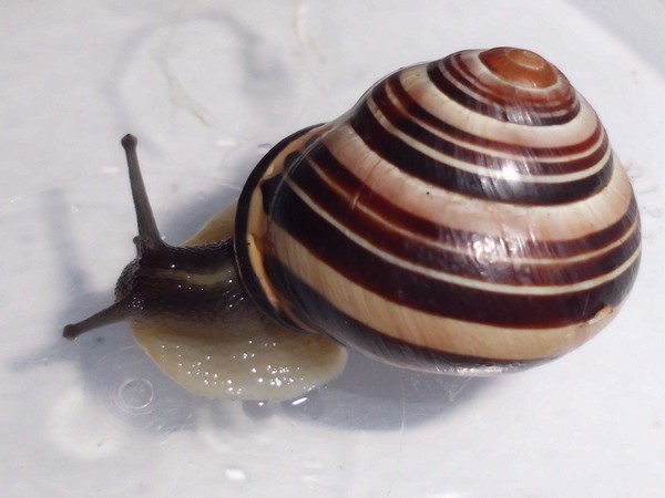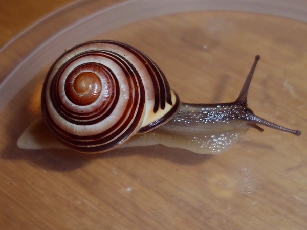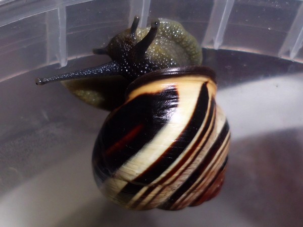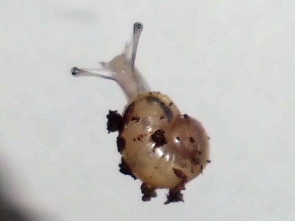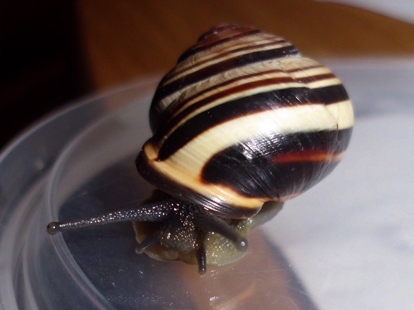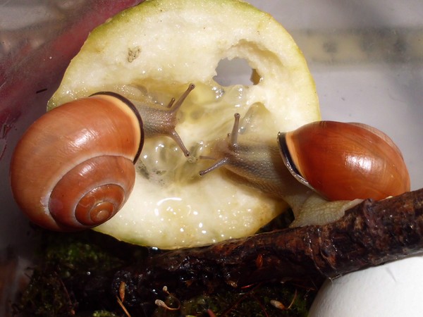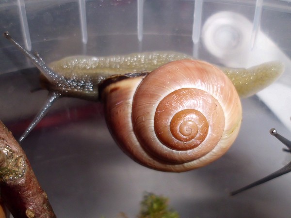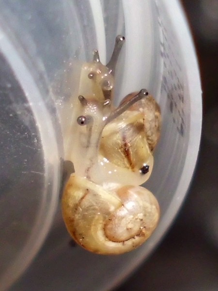 Und ein Knautschgesicht: die Schnecke mit der kleinen Beschädigung des Mündungsrands.