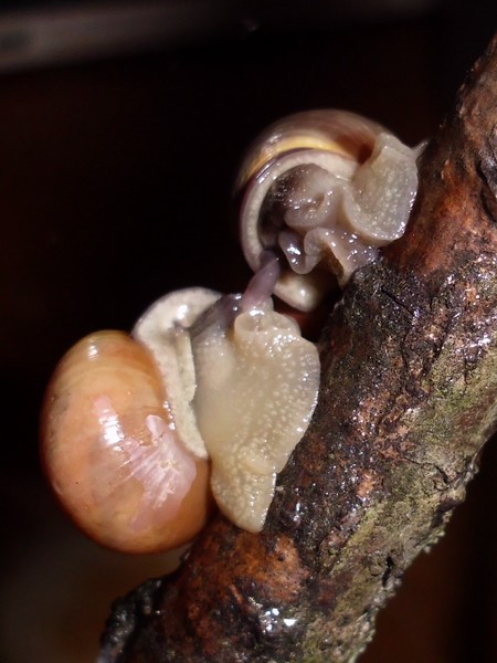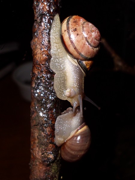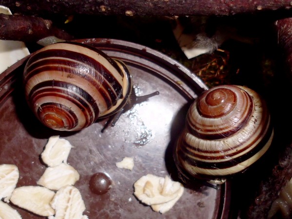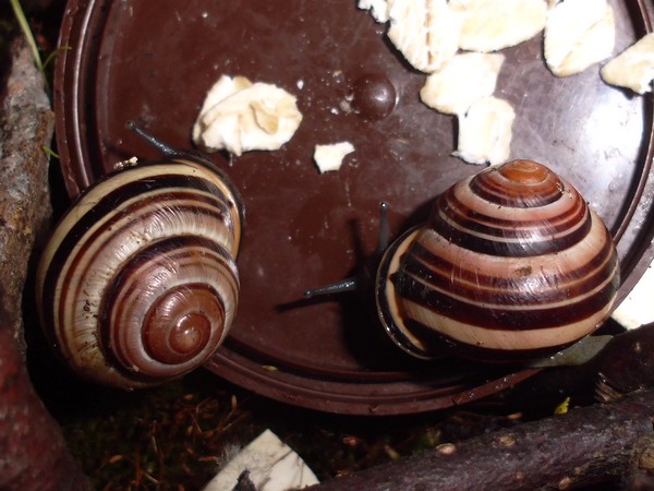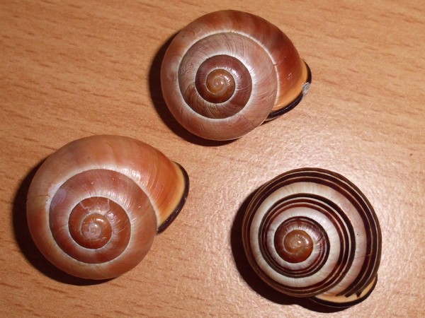 Hier habe ich noch einpaar Bilder von den beiden gestreiften. Das Haus der linken (die aus der ersten Dreiergruppe stammt) hat in der letzten Windung eine kleine Einkerbung, die Streifen gehen minimal versetzt weiter. Auf dem zweite Foto ist sie rechts, da kann man es etwas besser erkennen, diese frühere Bruchkante ist hier praktisch mittig.