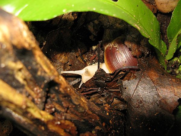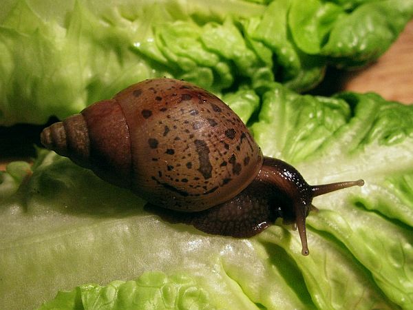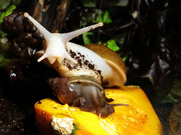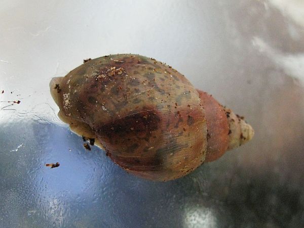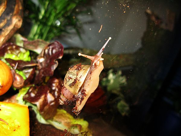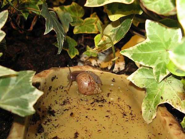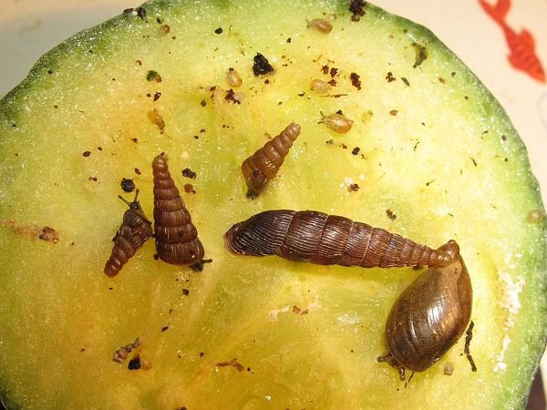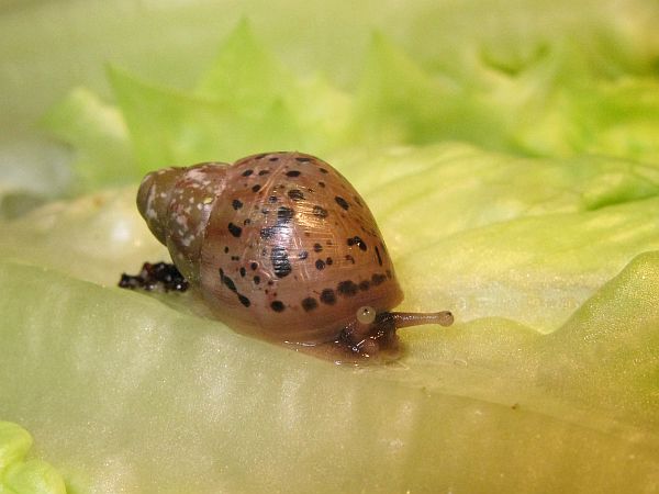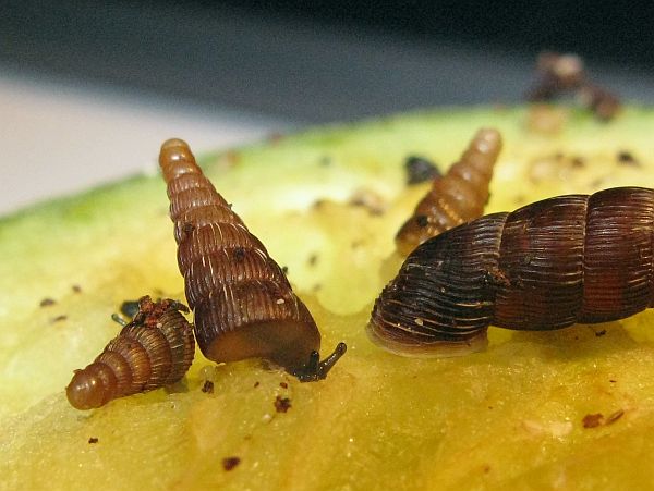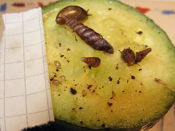 Die kleine gefleckte wird mal eine gelbe Schnirkelschnecke mit fünf schwarzen Streifen werden. Die Flecken kommen dadurch zustande, dass die Innereien noch durch das dünne Häuschen durchschimmern. Sie ist ~5mm groß. Sie und auch die anderen einheimischen Schnecken der letzten Seiten habe ich im Sommer mit ~3-4mm aus unserem Blumenkohl gepflückt. Diese Kleine ist leider kaum gewachsen im Gegensatz zu ihren Kumpeln.