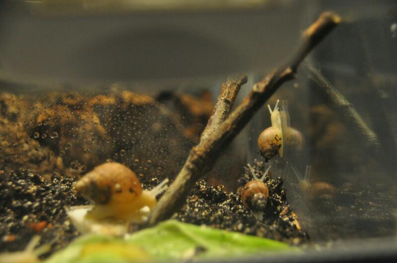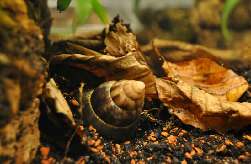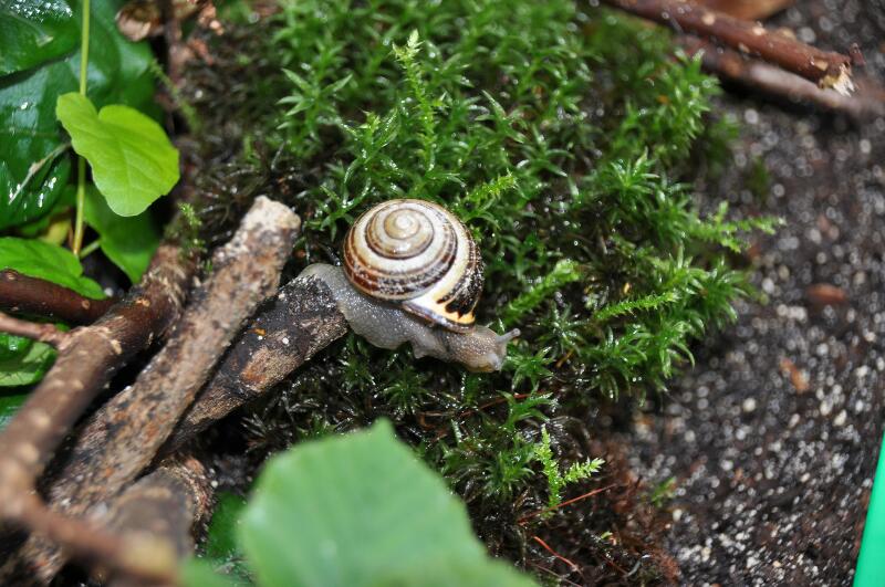 Auf dem Nachhauseweg gibt es neuerdings eine Stelle, wo mein Sohn die Häusschen von Bänderschnecken sammelt. Freitag war ein Häusschen aber nicht leer und der Kalkdeckel war schon weg. Spontan haben wir sie mitgenommen und sie ins Grunzterra gesetzt. Da Lili immer noch schläft, ist das sicher kein Problem. Wenn es keinen Frost mehr gibt, darf sie wieder gehen.