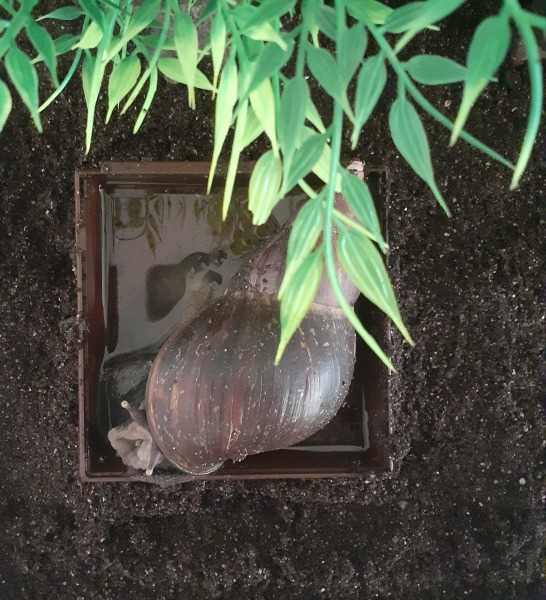 Arnold sitzt in der Wasserschale, das ist das Unterteil von einem Vogelbad, ich hab das mal so provisorisch reingetan, hat sich aber bewährt. Es ist aus Plastik, nicht zu tief und der Boden ist griffig. Arnold liebt das Ding.