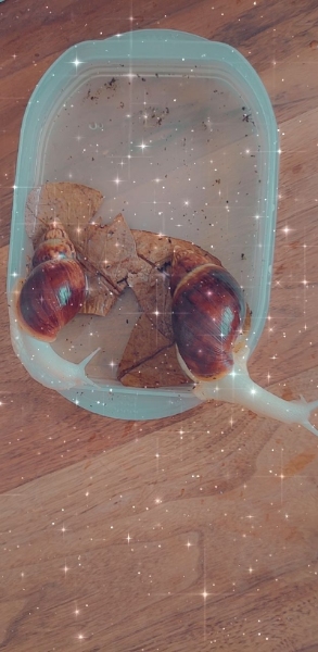 Ich konnte sie einfach nicht leiden sehen. Ihr Zustand hatte sich gebessert. Aber sie war von der Zeit inder Schule einfach zu erschöpft. Die Schnecken wurden da ja stündlich in verschiedene Hände gegeben. Sie hatte nur 3 gramm für ca 5 cm. Und hat nicht mehr gefressen, egal was ich versucht habe. Angebaut hat sie auch nicht mehr. Sie lag dann nur noch mit der gehäuseoffnung nach oben im terra, was kein gutes Zeichen ist. Ich habe dann den Entschluss gefasst sie zu erlösen. Das fiel mir nicht gerade leicht, weil es meine lieblings Schnecke war. Heute weiß ich, dass es richtig war, sie nicht leiden zu lassen... 4 Tage danach ist dann meine 2 lieblings Schnecke gestorben. Ich war zu der Zeit ziemlich geschockt und krank. Ich hab es nicht glauben können. Ruht in Frieden ihr 2 und es tut mir soo leid. Ichhoffe ihr seid jetzt glücklich und hattet keine großen Schmerzen.