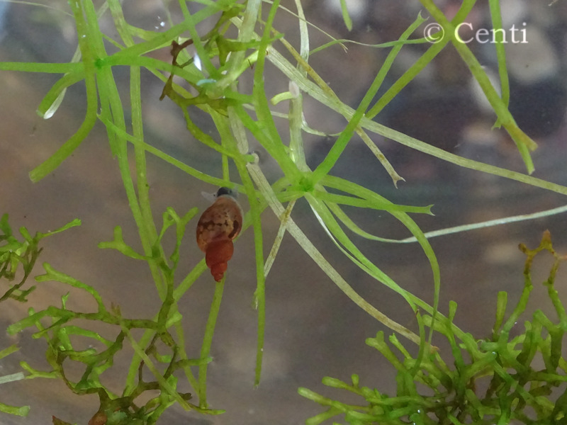 Und weil wir schon beim Thema sind, kann ich auch Fotos von einer meiner Blasenschnecken zeigen (ich weiß nach wie vor nicht genau, wie viele das eigentlich sind - die winzigen Viecher verlaufen sich in dem verhältnismäßig riesigen Gurkenglas total. Vor allem wenn sie irgendwo in den Pflanzen sitzen, sieht man sie einfach nicht. Was ja sicher schön ist für die Schnecken).
