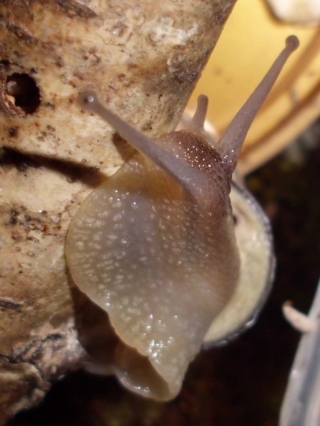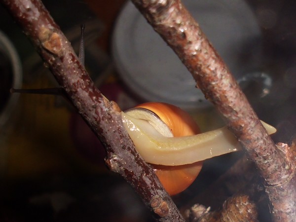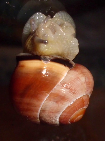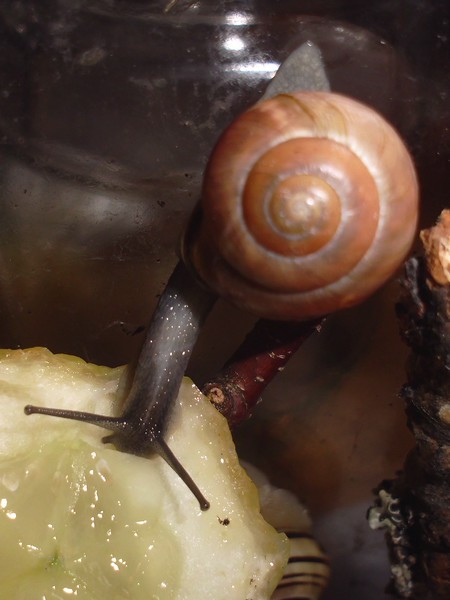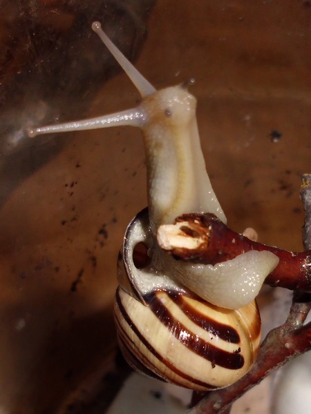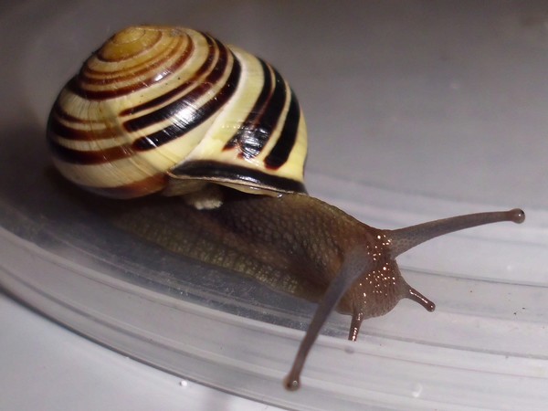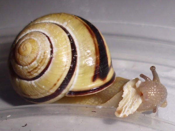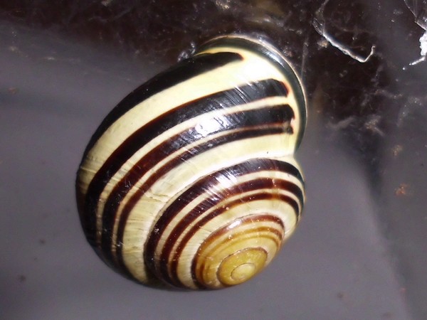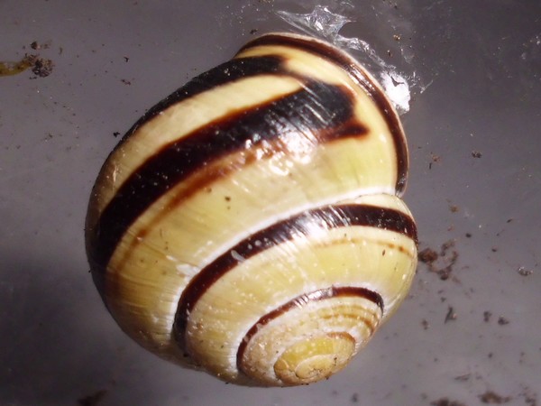 Neben einer Hecke lag dann diese hübsche Schnecke, die natürlich auch den Fototermin verschlafen hat. Sie hat einen hellen Weichkörper, der relativ gelb ist, man könnte sagen, passend zur Grundfarbe des Häuschens.