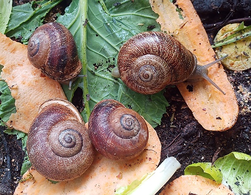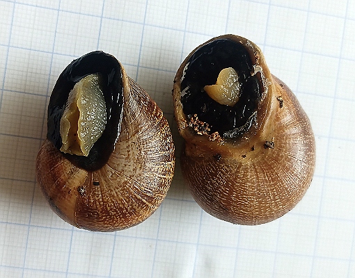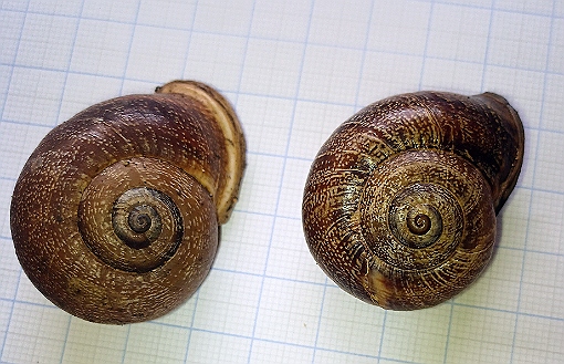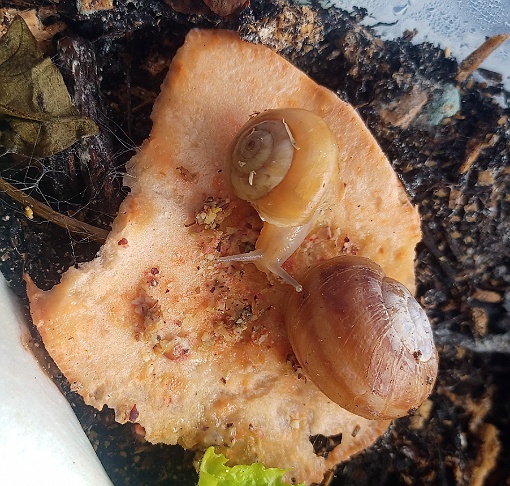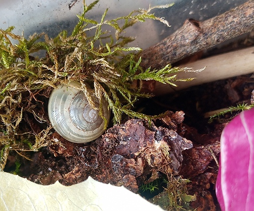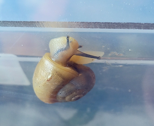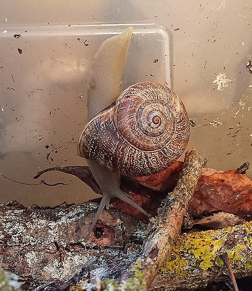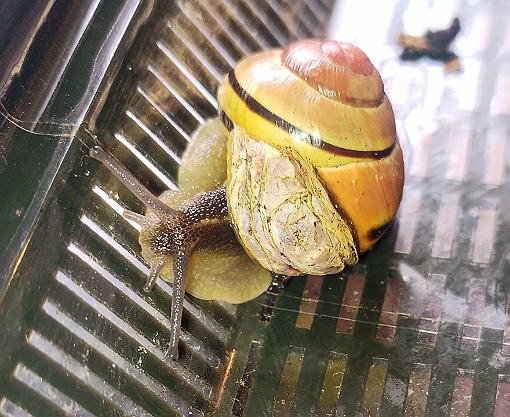 Bei den Bänderschnecken gibts auch Neuigkeiten - ich hab neulich abends ein total ausgefallenes Exemplar gefunden. Das ist wohl eigentlich eine vielfach gestreifte - aber als Hausalbino? So eine Farbe habe ich noch nie gesehen. Der Körper hat eine dunkle Zeichnung.