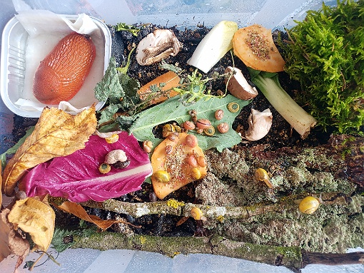 Und noch ein Stimmungsbild von der neuen Otala. Die hat sich sehr gut eingelebt, kennt schon die Badeschale und die besten Schlafplätze. Besonders gerne schläft sie im Laub.
