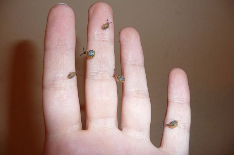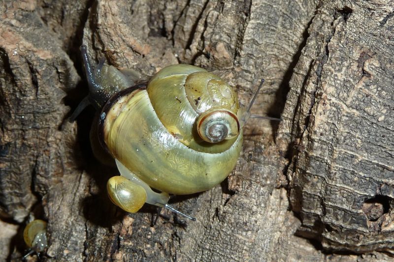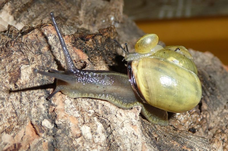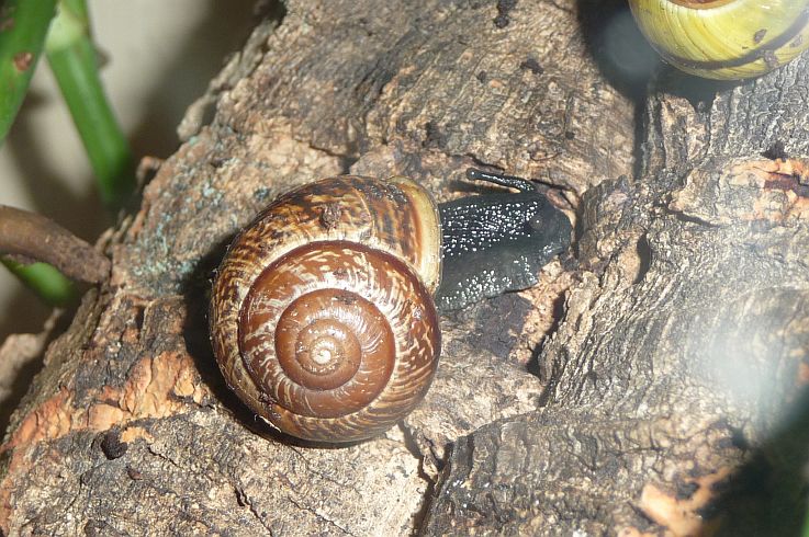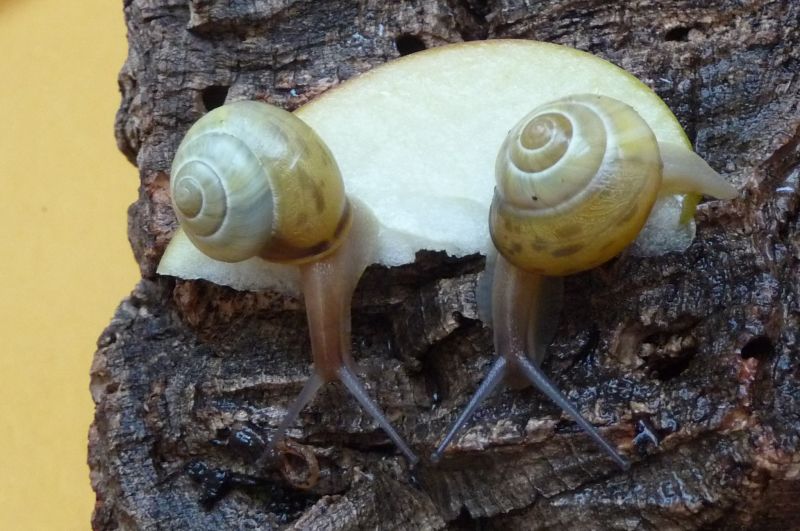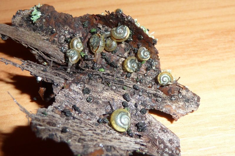 Die Kinder von Ernst sind gewachsen und bekommen teilweise Schnirkel am Häuschen. Als es einmal ein Stück Rinde mit Flechte zu Futtern gab, saßen einige nach dem Fressen zum Schlafen unter dem Rindenstück und hatten offensichtlich fleißig verdaut...