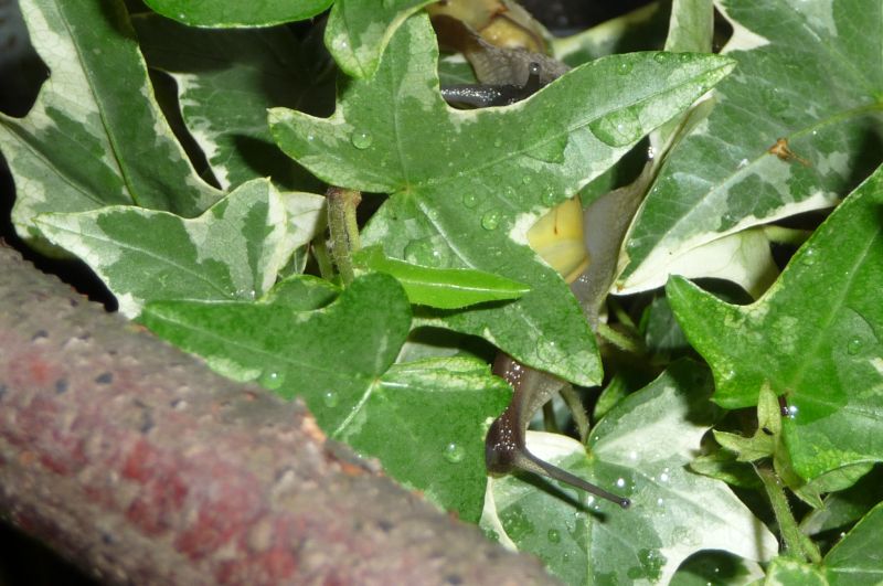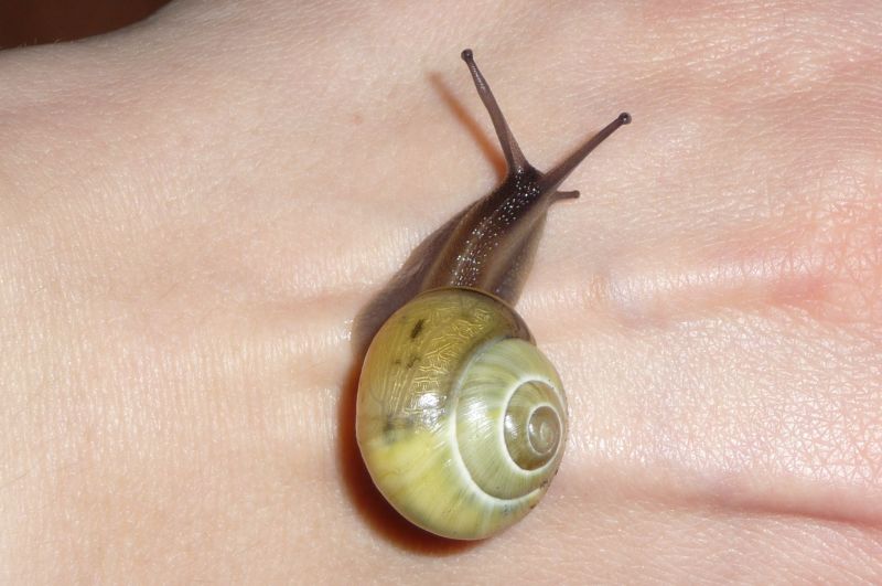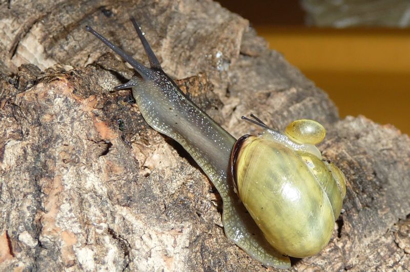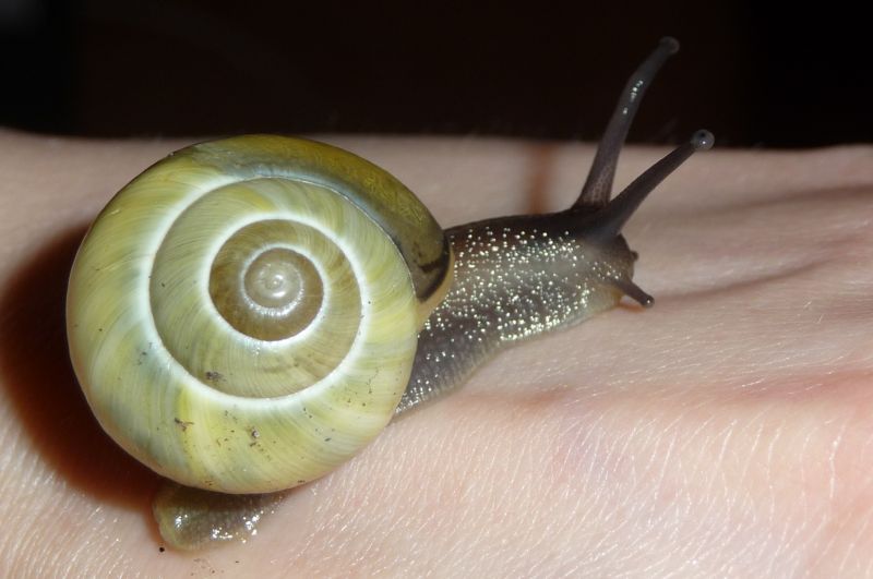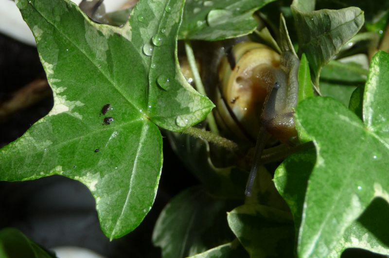 Eine der jungen Baumschnecken hat mal eben drei Wochen Sommerpause gemacht... in der Zeit hing sie am Deckel des Terrariums, während die Artgenossen munter umherschneckten und und vor allem: Fraßen! Jetzt ist sie wieder munter, aber man sieht, wieviel größer die andere Jungschnecke im Vergleich zu ihr geworden ist. Außerdem hat deren Haus einen schönen Rot-Ton bekommen.