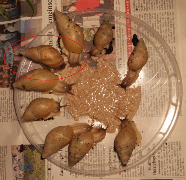 fressen schön, wachsen schön, wobei ein paar von den Kleinen angefangen haben etwas komisch anzubauen, also so als ob eine Drüse ausgefallen ist, aber dann geht's wieder normal weiter. Da Goldie solche Phasen in ihrem Häuschen auch hat, gehe ich davon aus, dass es Vererbungsbedingt sein könnte. Hab ihnen aber trotzdem mal Getreidebrei gegeben. Es sind auch nur schlecht sichtbare, ganz feine Streifen.Auch Groß-Goldie ist wieder unterwegs seit 2 Wochen und hat schon wieder ein Häufchen Babys hinterlassen. ^^ scheint noch Reserven zu haben...