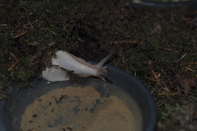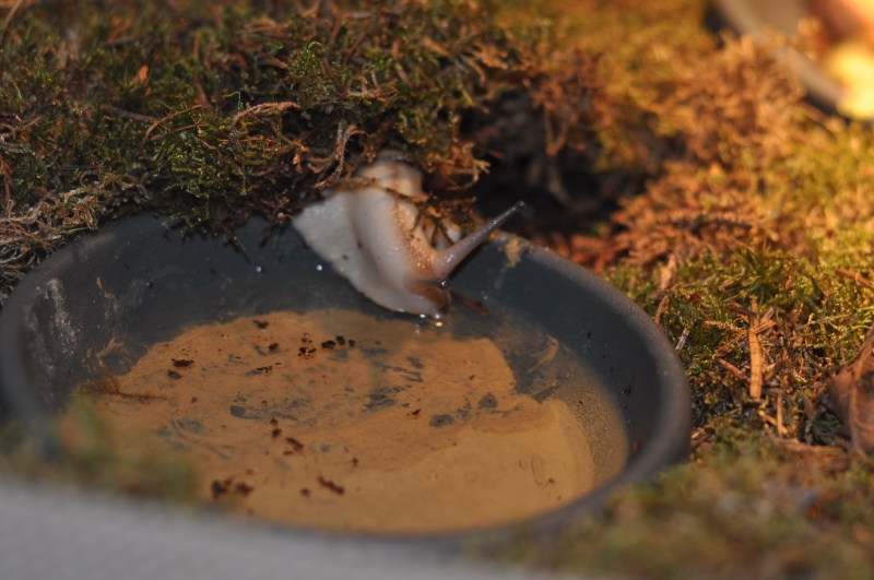 Ich hab mich vorhin total gefreut, als ich eine kleine weiße Schnute sah. Galadriel hat ihren Kopf in die kleine Wasserschale (mit Heilerde) reingetunkt. Leider weiß ich nicht, ob es normal ist, dass sich die Heilerde einfach auf den Boden liegt. Schneck schien es nicht zu stören.