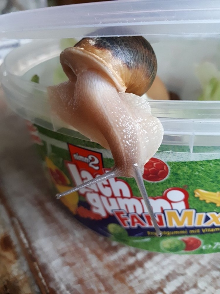 nachts habe ich die Cornu aspersum, die nun erwachsen werden, beim Liebes spiel beobachten können. Ich sah sie zunächst oben an der Deckscheibe hängen. Die nahm ich nach ein paar Aufnahmen vorsichtig ab um andere Perspektiven zu haben. Und wie gut, sie ließen sich auch nicht stören. Sogar am nächsten Morgen waren sie noch zusammen. Und ich zeige das hier mal, weil es mir gelang die Liebespfeile so schön nachzuweisen. Das hab ich so auch noch nicht gesehen.