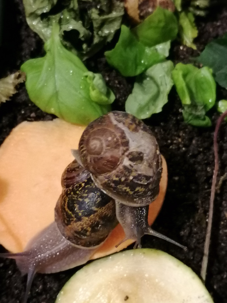 anbei mal paar neue Bilder der Cörnchen, also Laternenheinz ist echt gut ( an seiner Halbglatze gut zu erkennen) , er lässt sich gerne von A nach B von anderen Schnecken tragen
