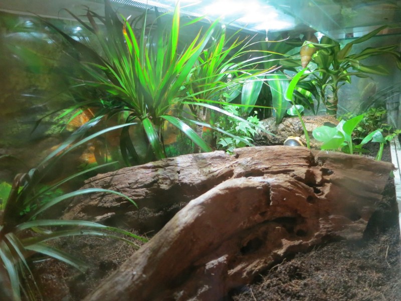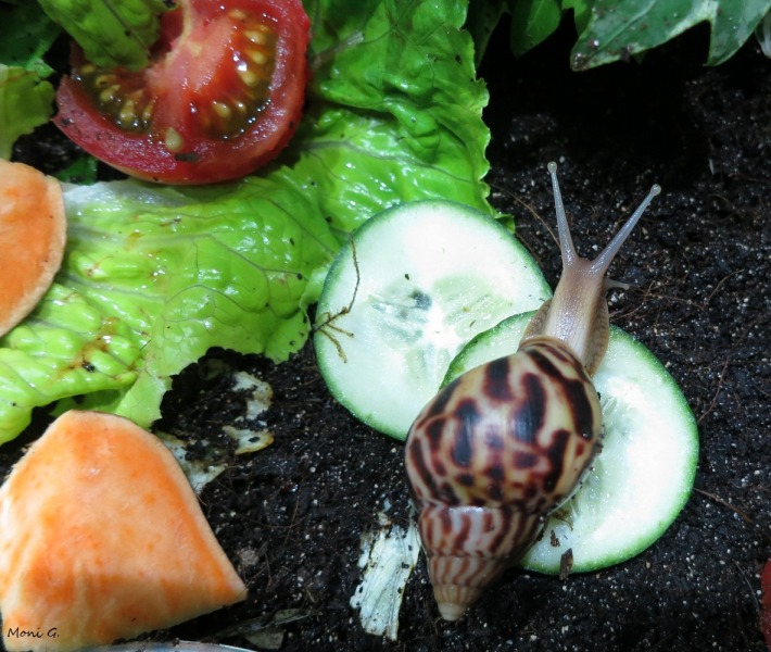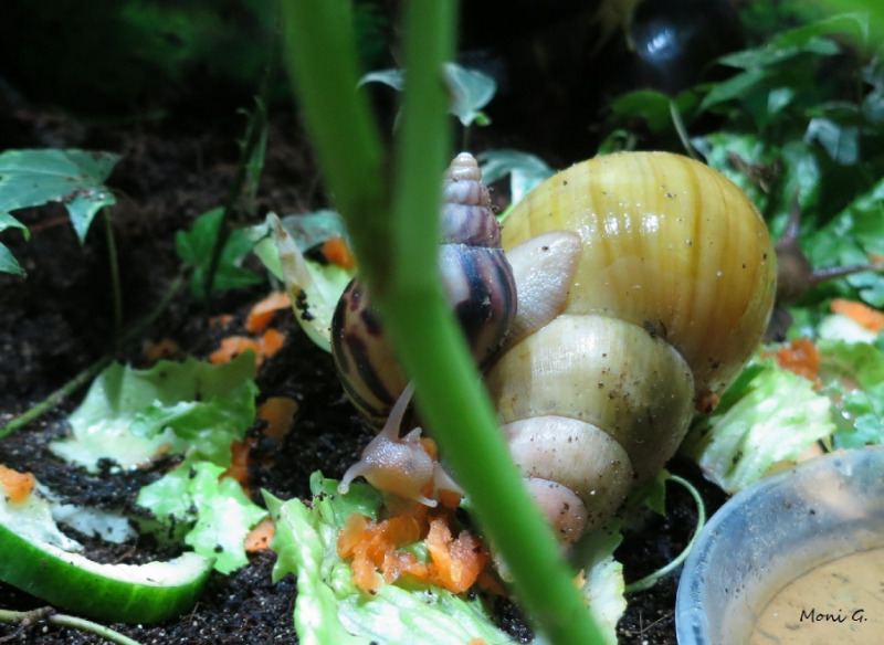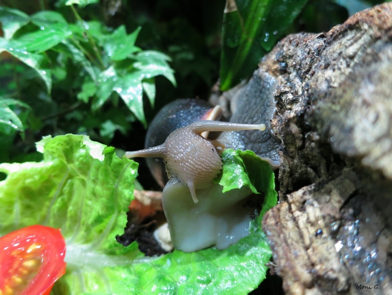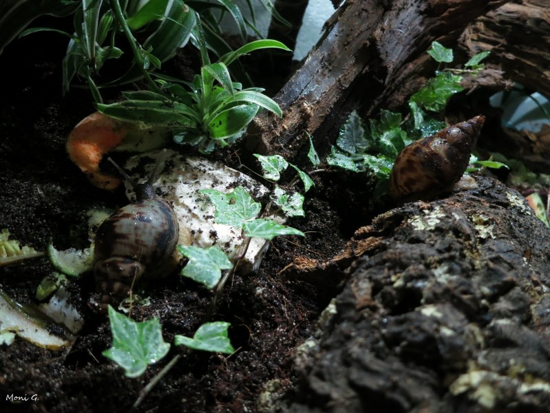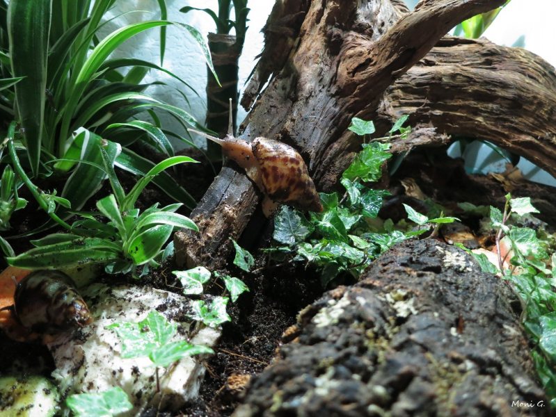 Paulchen ist flott aus seinem Behältnis rausgeschneckt, hat kurz an der Süsskartoffel genagt, ist dann auf seine extra mitgereiste Sepia, hat da auch zwei mal geraspelt und schaut sich gerade etwas aufgeregt das Terrarium an. Hoffentlich erstarrt er nicht, wenn er die dicken Brummer sieht, die jedoch an der Decke hängend schlafen. Habe ganz viele Bilder geschossen, hier eine kleine Auswahl: