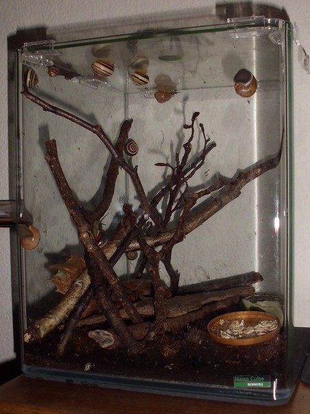 Im linken Bereich sind hauptsächlich die Kletterzweige, ein kleiner Laubhaufen, Borkenstücke und ganz hinten, auf dem Bild nicht zu sehen, Eierschalen. Rechts ist die "Jausenstation", im Moment Deckelchen mit Haferflocken, eines mit Gurke und ganz hinten die Badeschale, die auch durch Plazierung auf einem Borkenstück nicht immer vor dem Umkippen durch drunterkriechende Schnecken geschützt ist.