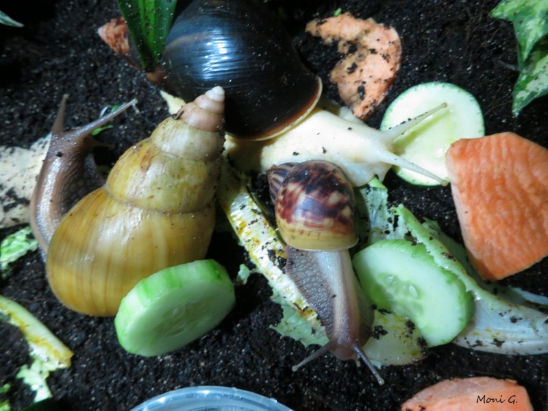 Ansonsten geht es allen Schleimern prima. Es ist sehr interessant, wie unterschiedlich sich die Schnecken entwickeln. Meine Reticulata's stammen von 4 verschiedenen Haushalten ab. Super wachsen die "Grossen", Sandy's "Kleine" und die "Minis". Alle haben tolle Wachstumsränder und man kann ihnen beim Wachsen wirklich zusehen. Das andere Duo - die Sorgenkinder "Midis" - wachsen hingegen schlecht bzw. kaum. Obwohl sie inzwischen auch recht gut fressen, bauen sie nur minimal an, vielleicht sind sie ja schon ausgewachsen ?