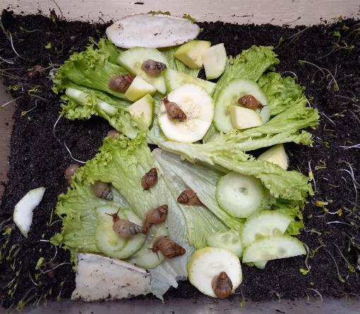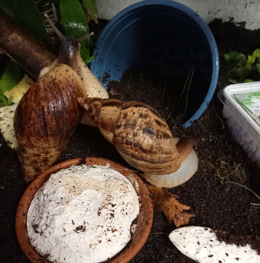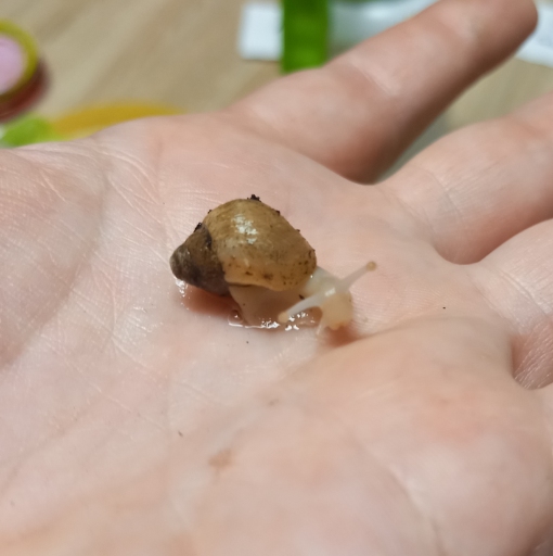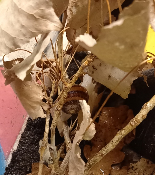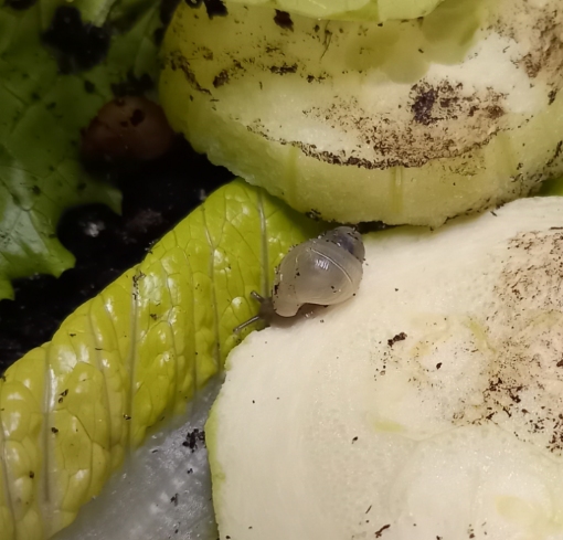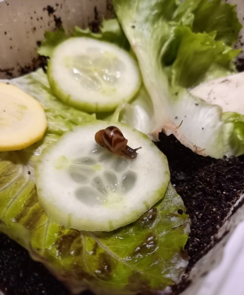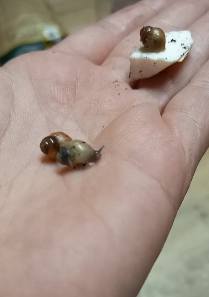 Und Schnecki... nun es war abzusehen. Gestern schneckte sie noch rum. Vor einer Woche ist sie einfach von der Wand in ihrem Becken in die Erde gefallen und hatte einen Loch im Wachstumsrand. Da habe ich festgestellt das ihr Häuschen wirklich dünn wie Papier ist. Und als ich heute Abend den Deckel öffnete, lag die kleine Kämpferin da mit einem ziemlich zerstörten Häuschen. Es war ein trauriger Anblick. Da hab ich sie über die Regenbogenbrücke geschickt.