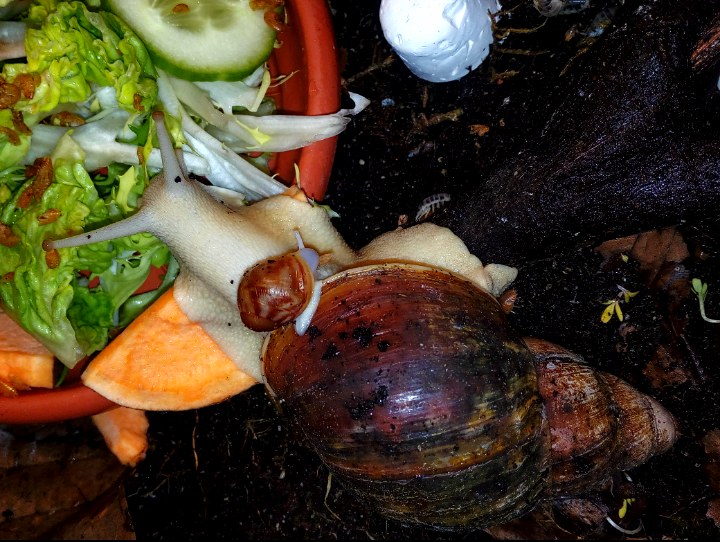 danke für die Kommentare. Die kleinere schaut jetzt schon etwas besser aus. Beide sind jetzt deutlich aktiver. Ob die Tomaten etwas abgeben, das Schnecken nicht mögen, kann ich nicht beurteilen, jedenfalls wenn man die Box aufgemacht hat, war der Tomatengeruch sehr stark.