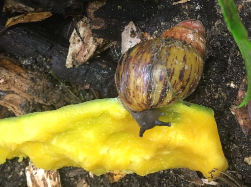 Die Schnecken fressen gerne Pilze,Süßkartoffel,Gurke,etwas gekochte Gemüse,wenig Obst,Flechten,Flocken und sehr viel Kalk.Unterschiedliche Kalkquellen sollten immer zur Verfügung stehen.