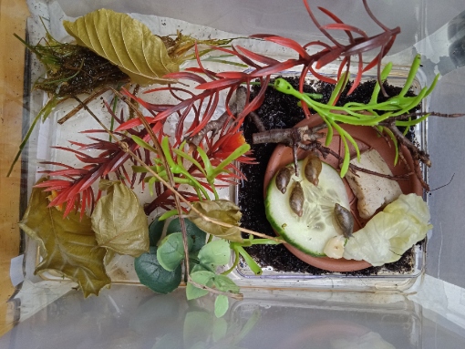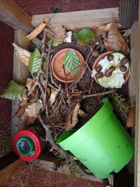 Ich hatte das Außengehege über dem Winter in einem Bauwagen der in unserem Garten steht. In dem Außengehege war noch etwas Erde vom letzten Jahr. Im Bauwagen waren Mäuse und irgendeine davon hat ein Loch ins Außengehege gemacht und Buchecker in der Erde vergraben. Um das gesamte Außengehege ist nochmal Fliegengitter, sieht man auf dem Bild kaum.