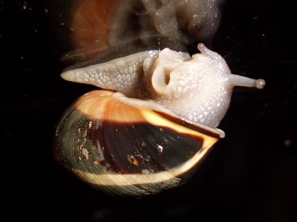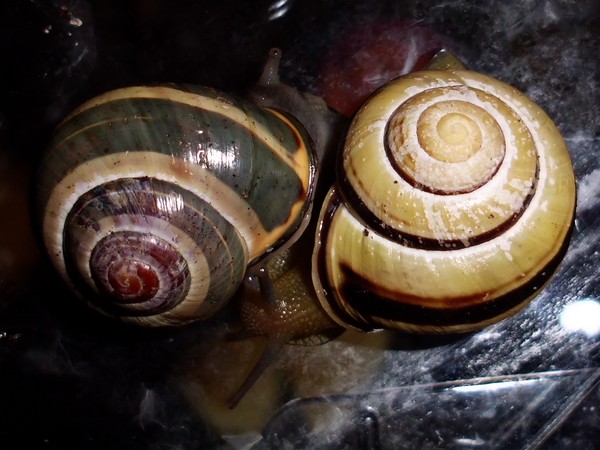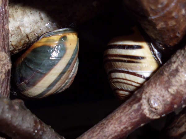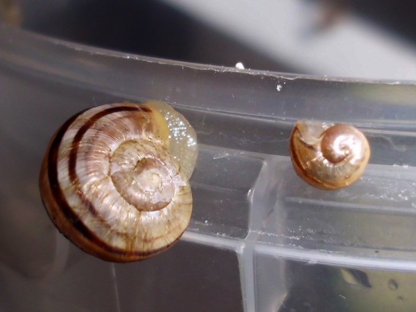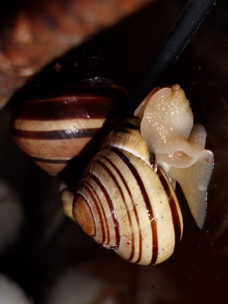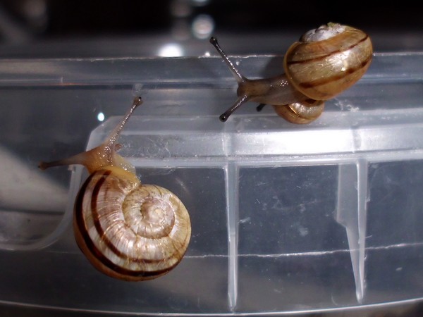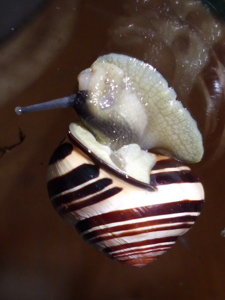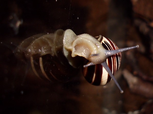 Sonntagmittag war mal wieder Schneckenheim-Putzen mit Eiersuche (nichts gefunden) dran. Die an Zweigen oder Blättern oder unter den Rinden klebten (und schlummerten), wurden mitsamt ihrer Unterlage in eine offene Dose befördert, die am Deckel mit demselben auf eine Dose gelegt, die an den Wänden schliefen, blieben, wo sie waren. Bei der ganzen Aktion wurden dann noch die Eingebuddelten eingesammelt, danach alles kontrolliert und gereinigt und wieder eingerichtet. Inzwischen war natürlich die halbe Bande munter; alle die ich zurück setzte. kontrollierten genauestens, ob die Zweige noch klettertauglich waren, und unternahmen Ausflüge zum und über den Rand, während ich versuchte, die drei von der Abdeckung dazu zu bewegen, auch wieder in ihr schönes sauberes Zuhause zu gehen. Der Deckel wollte ich ja schließlich auch noch säubern. Das gelang auch, und am Ende waren sogar alle Schnecks wieder dort, wo sie sein sollten.