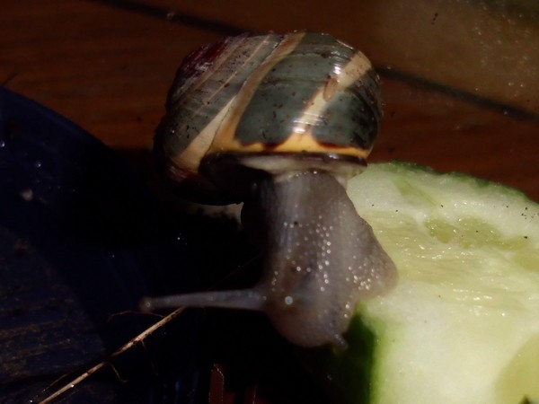 Etwas über eine Stunde später muss dieser Schneck aber doch das Bad ausprobiert haben, bevor er sich die Schale der zweiten Gurkenhälfte vornahm.