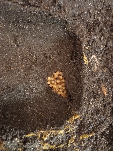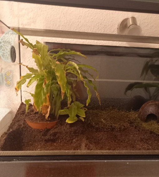 Und dann hatte meine größte Reticulata auch noch einen Unfall. Loki ist wohl von oben runtergefallen, und mit seinem Apex voran in die Badeschale gefallen.... wir saßen grade alle beim Essen, als es knallte. Ich wusste sofort was passiert war. Loki hat ein Stück seines schönen Häuschens verloren. Die Spitze fehlt. Aber es geht ihm gut. Es ist kein Loch da und Flüssigkeit kam auch nicht raus. Er hatte viel Glück. Keine 10cm entfernt schlief Zeus im Moos...