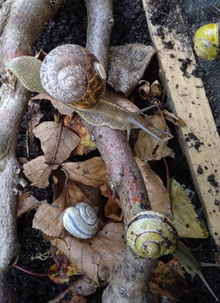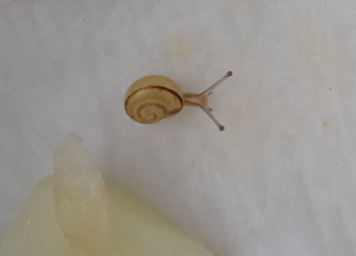 Die kleinen Hain-Bänderschnecken wachsen schon und ich meine bei allen einen kleinen leichten Streifen zu sehen.