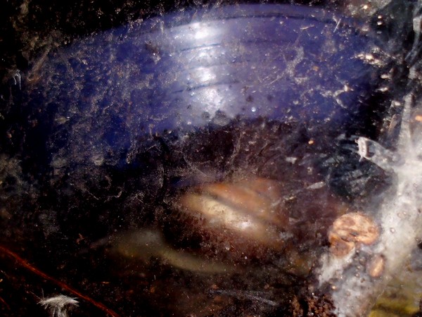 Da hatte ich mir gedacht, wenn ich den flachen Deckel, der als Badeschale diente, gegen einen tieferen Blumentopfuntersetzer austausche, kann das Wasser nicht so schnell überschwappen, wenn meine Rabauken ihn mal wieder leicht anheben. Und wenn er etwas in den Untergrund eingelassen ist, kommen sie (vielleicht!