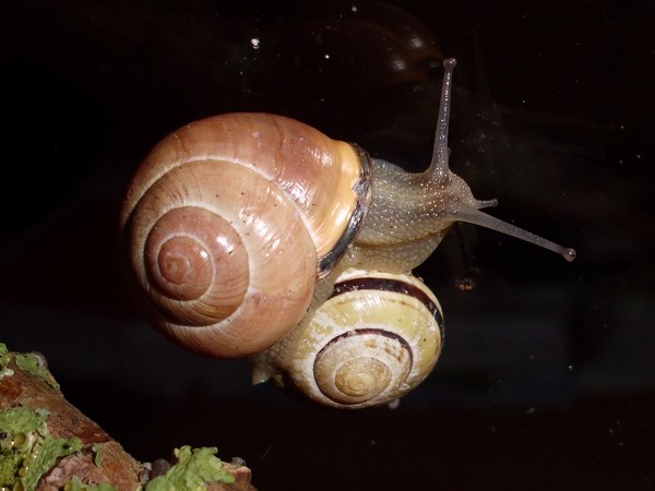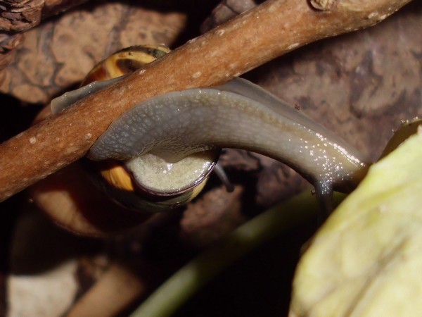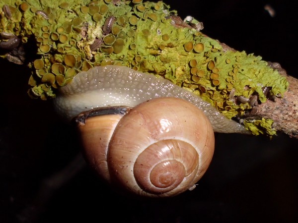 So, hier sind noch einige Fotos von Anfang August. Es gab endlich mal wieder einen Zweig mit Flechten, und recht schnell meldeten sich ein Paar Schnecks freiwillig zum Putzdienst.