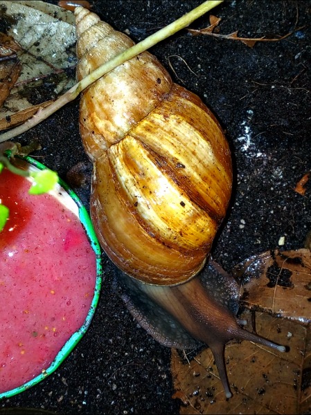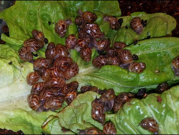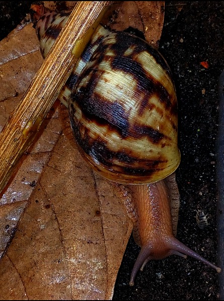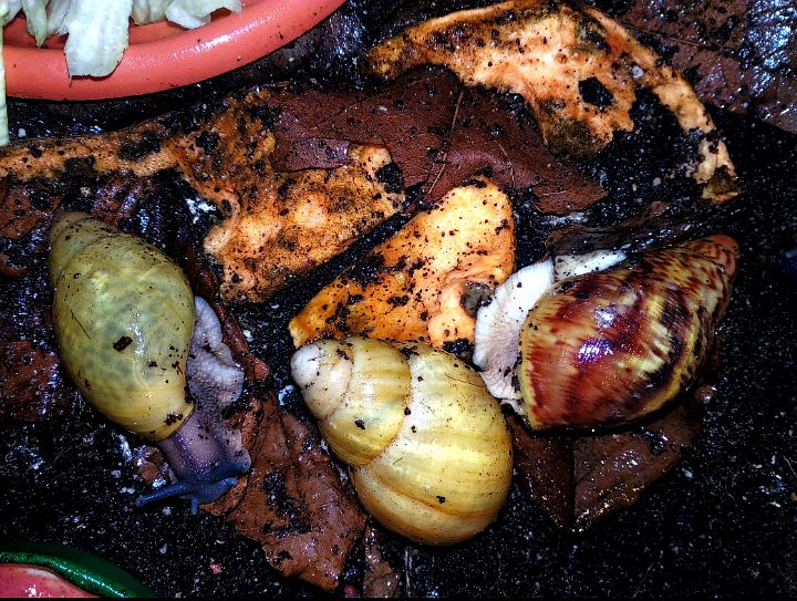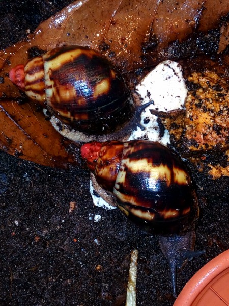 Meine wunderschönen wildfarbenen albopicta, Gehäuse 11 - 12 cm mittlerweile und frisch geschlüpfte Jungschneckis. Wieder müssen sie die bis kurz vor dem Schlupf mitgetragen haben, fast schon "Lebendgebährend"