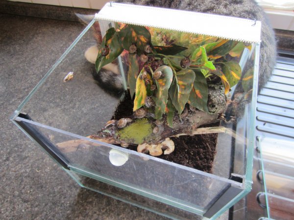 Die Hemiplectababys wachsen und gedeihen.Die zuerst geschlüpften sind jetzt vier Wochen alt und 1cm groß.(Und zur Abgabe an ERFAHRENE Halter bereit