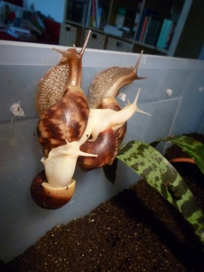 Ich habe gerade die ersten Bilder von den Schneckis hier gesehen und mensch, waren die mal klein! Das kann man sich jetzt schon gar nicht mehr vorstellen, bei den Brummern! Ich weiß noch, dass ich damals mich so drauf gefreut hab, wenn die Vier ausgewachsen sind - und jetzt passt nur noch eine Schnecke auf eine Handfläche anstatt vier!
